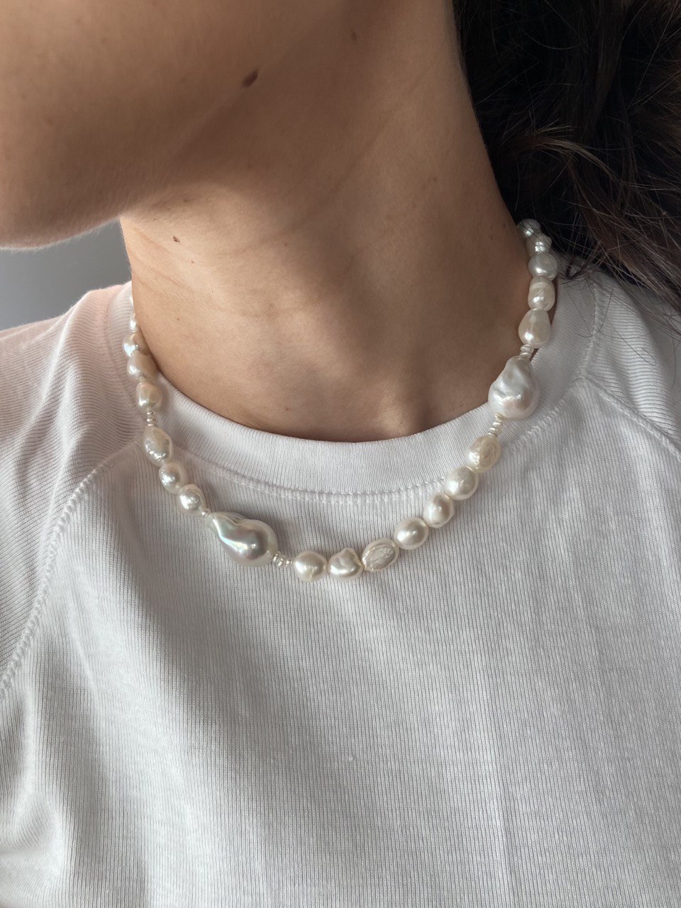Length: 40+5 cm Materials: baroque pearls, zircons, stainless steel