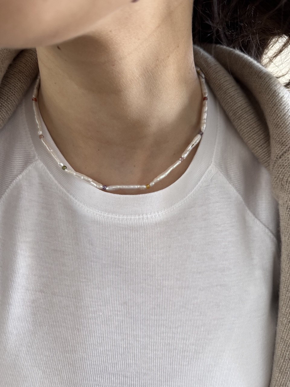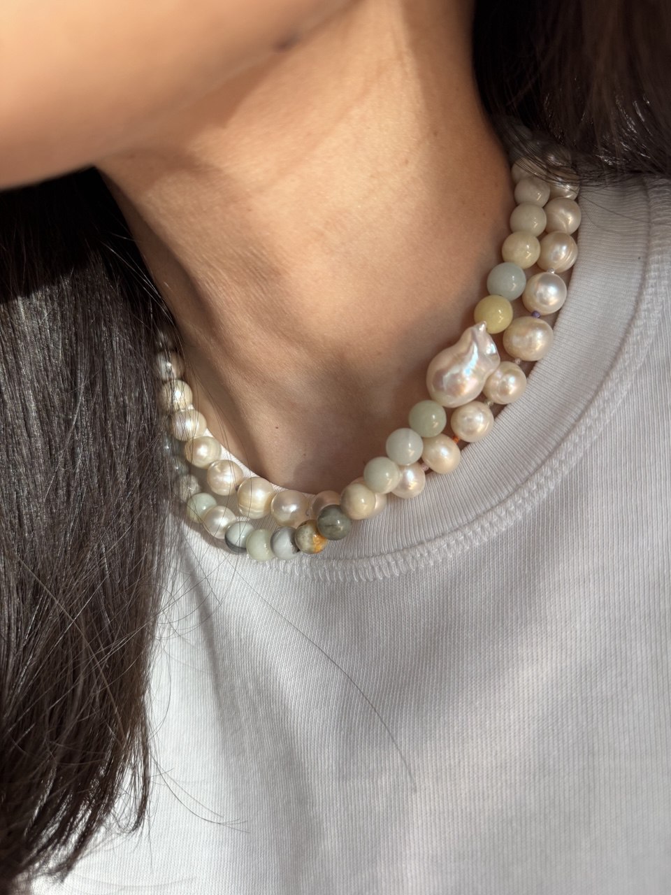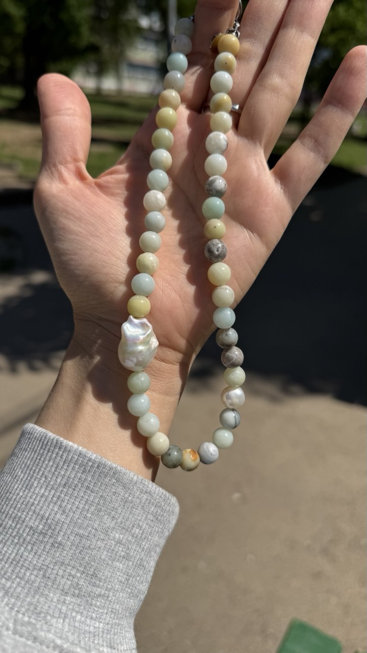 Length: 40 cm Materials: pearls, baroque pearls, glass, stainless steel