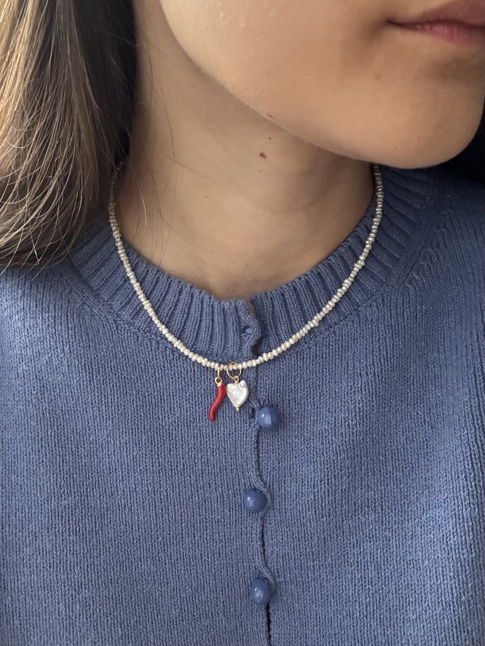 The necklace has 19 handmade bead hearts. Making one necklace takes around 9 hours of manual work. Also available with silver color fittings.